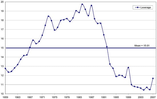 Interestingly, the value of these coefficients is close to the actual historical mean leverage of depository institutions, which is equal to 15.01. Figure 3 graphs the actual leverage for a broad sample of U.S. depository institutions over the period 1959–2007.23 Since the late 1980s, leverage has drastically dropped. This corresponds to the adoption of several rounds of Basel accords regarding capital adequacy ratios, starting in 1988.