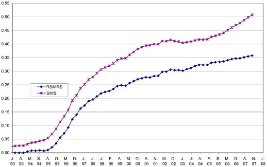 Retail and total sweeps, respectively, as % of M1RS and M1S 1994–2007.