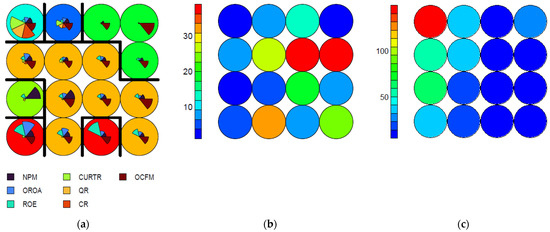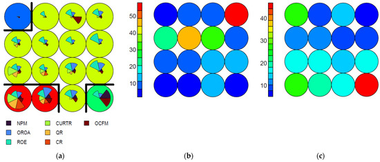As can be seen in Figure 2a, five main groups of companies were distinguished in 2020, indicating a greater variety of companies than in 2019. The first group of companies—which can also be described as “ordinary” companies—is located in the yellow-marked cluster. The second cluster, marked in bright green, includes companies with relatively moderate (OROA) to high (NPM, ROE, and OCFM) levels of profitability and CR but at the same time low levels of CURTR and QR. Interestingly, companies in this cluster differ from “ordinary companies” only in that they have the relatively highest level of CR. In fact, this is the only cluster containing companies with such a level of CR. The third group of companies—in the nodes marked in turquoise—is characterized by relatively high ROE, CURTR, and QR only. The fourth cluster, marked in red, contains companies with relatively high levels of NPM and OCFM only. The fifth cluster, marked in blue, consists of companies which are unique, in that they are the only ones with the relatively highest levels of profitability (both accrual and cash) and the lowest levels of liquidity.