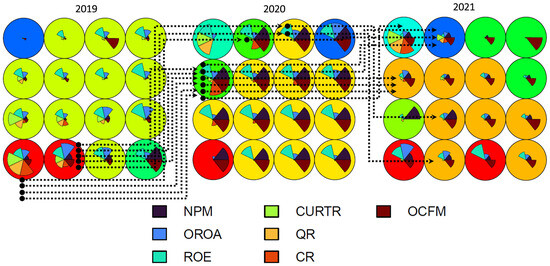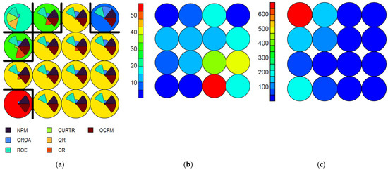 As can be seen in Figure 1a, four basic groups of companies can be distinguished in 2019, which are similar in terms of net profit margin (NPM), operating return on assets (OROA), return on equity (ROE), current ratio (CURTR), quick ratio (QR), cash ratio (CR), and operating cash flow margin (OCFM). The first group of companies is located in the most numerous cluster containing 12 nodes marked in green. These are companies with a diverse but relatively moderate level of ratios. Here, it should be noted that the relative level ratio—as the name suggests—is due to comparison with other companies. The second group of companies—in the nodes marked in red—is characterized by relatively high profitability (both accrual and cash) as well as relatively high liquidity. The third cluster, marked in green, contains companies with relatively moderate to high levels of profitability (both accrual and cash) but at the same time, the relatively lowest levels of liquidity. The last, blue cluster identified in 2019 contains companies with the relatively lowest levels of all ratios examined in this study. These four clusters can be labeled with simplified buzzwords, acting as convenient descriptors for subsequent analysis: “ordinary” companies, “liquid & profitable” companies, “illiquid & profitable” companies, and “near bankruptcy” companies.