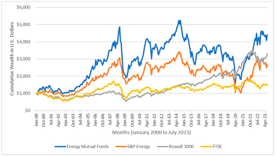 Cumulative wealth effect of investing USD 1000 in energy equity mutual funds relative to S&P 500 Energy Index, Russell 3000 Index, and FTSE All World Ex U.S. Index. Analysis is based on monthly returns from January 2000 to July 2023.