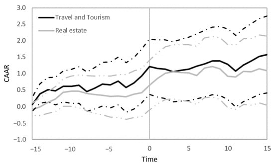 CAAR Analysis of North American indices: travel and tourism vs. real estate industry across a 31-day event window. Note: The x-axis signifies the time period relative to the event day. The black lines illustrate the cumulative average abnormal returns (CAAR) within a 31-day event window for the travel and tourism industry, while the gray lines depict the CAAR within a 31-day event window for the real estate industry. The dashed lines indicate the 95% confidence intervals.
