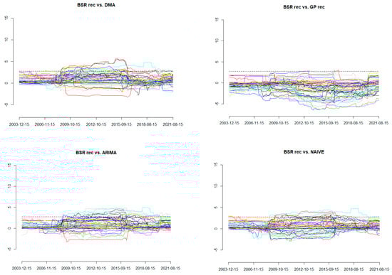BSR forecasts were compared with some alternative models. Of course, the standard symbolic regression with genetic programming (; ) was employed. Due to computational issues, the population size was taken as 50 and generations were reduced to 10. Earlier pre-simulations with some selected commodities’ time-series indicated that these numbers were high enough and there was no significant gain in forecast accuracy from taking higher values. On the other hand, lower values reduce the computational time. The cross-over probability 0.95 was taken; subtree, hoist, and point mutations probabilities were set up at 0.01. RMSE was applied as a metric. All in all, these are quite standard and common specifications (; ; ). The set of operators indicated by BSR model was considered for each of the commodity. (Indeed, an estimation of the recursive BSR model for the applied data took approximately 1.6 h on average; whereas, for example, Dynamic Model Averaging with Occam window for the same data took approximately 20 min only.)