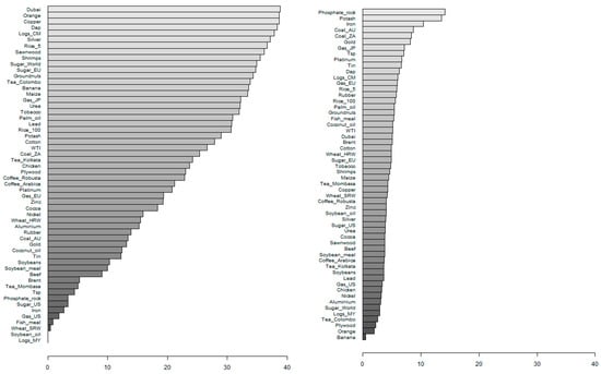 In general, certain common predictors for various commodities can be identified. Apart from the above-mentioned exchange rates, which were also analysed in the context of the overall commodity market (; ; ; ), and financial factors, it was found that crude oil and gold prices might enable good forecasts of other commodities’ prices (; ; ). As previously discussed, it seems that interest rates can also serve as commodity price predictors (; ). () provided a broad study, according to which the most important predictors were the investment-to-capital ratio and the growth of industrial production. () added supply and demand factors (in particular, with reference to emerging markets such as China), economic growth, and monetary policies. () argued that in the long term, demand forces play a more important role than supply shocks. This was also confirmed by (). Other predictors common for various commodities are the U.S. inflation rate, world industrial production, and the world stock index (). Furthermore, financialisation issues were discussed in the context of various commodities (; ). Moreover, the recent economic growth of several emerging economies resulted in increasing the demand for commodities (). () analysed various commodities and confirmed that macroeconomic uncertainty significantly impacts their prices.