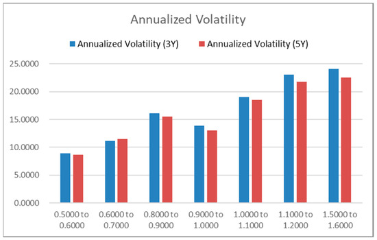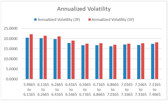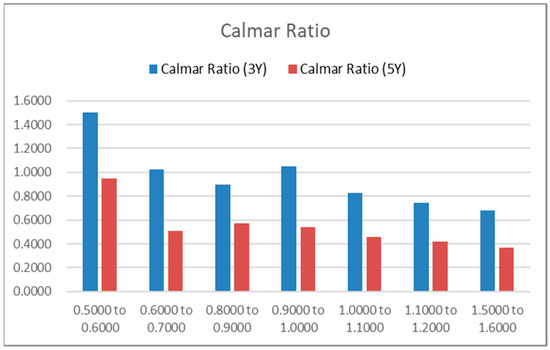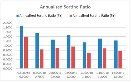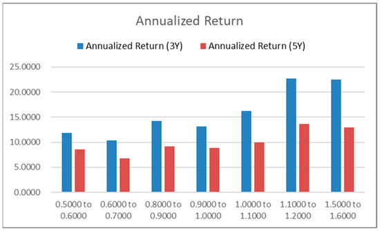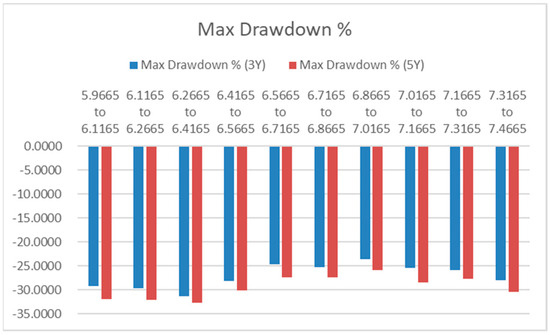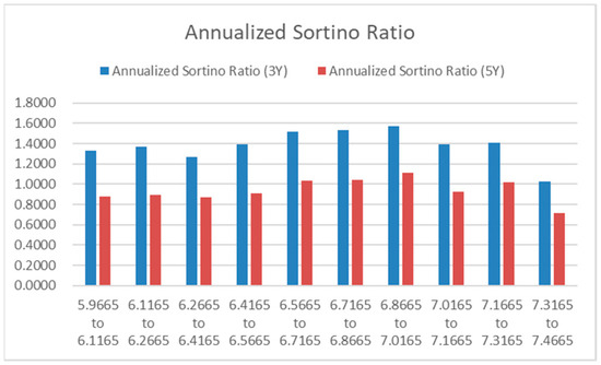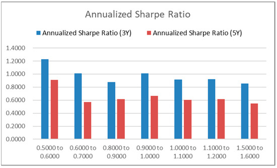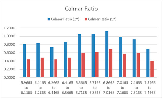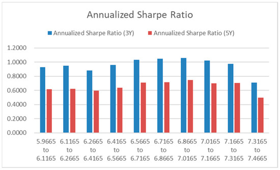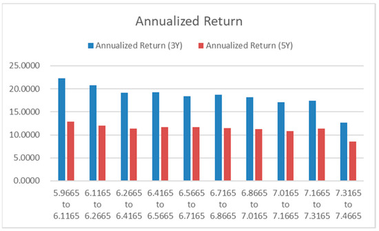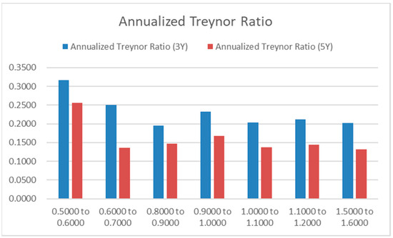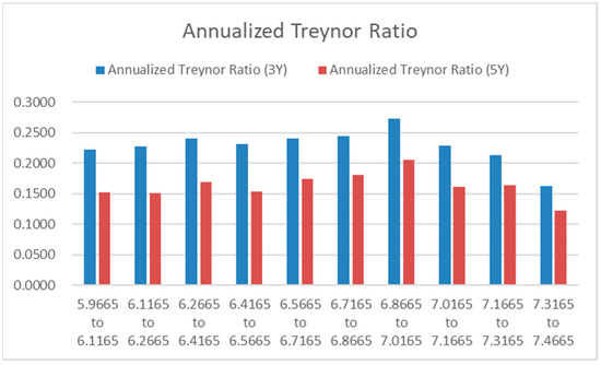 The figures presented above provide several key observations regarding the relationship between fund performance and ESG scores. Firstly, groups with higher ESG scores do not generate higher, and in some cases even exhibit lower, annualized returns (Figure 8). Secondly, groups with ESG scores in the middle section, which refers to the groups with ESG scores between 6.4165 and 7.0165, demonstrate lower volatility and lower maximum drawdown compared to other groups, indicating potentially lower risk levels (Figure 9 and Figure 12). Thirdly, overall, groups with ESG scores in the middle section display higher risk-adjusted returns, as indicated by metrics such as Sharpe Ratio, Sortino Ratio, Calmer Ratio, and Treynor Ratio (Figure 10, Figure 11, Figure 13 and Figure 14). The ESG score group “6.8665–7.0165” stands out as the best in terms of risk-adjusted returns, boasting the lowest volatility and maximum drawdown, despite its return being ranked in the middle. This group represents approximately 14% of the funds analyzed. Importantly, these distribution results remain consistent for both the 3-year and 5-year data periods, adding robustness to the findings.