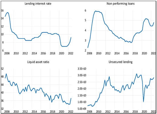 The dependent variable, RISK, serves as a measure of risk-taking, encompassing three proxies. Firstly, the liquidity ratio is utilized, where a lower liquidity ratio indicates heightened risk-taking activities in a bank (). Secondly, non-performing loans gauge the bank’s exposure to default risk (; ). Lastly, unsecured lending is employed as a measure of risk-taking, reflecting the extent to which a bank is willing to engage with riskier clients by providing loans without collateral (). The main independent variable, INT, represents the interest rate and is proxied by the lending rate.
