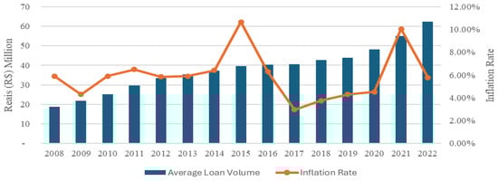 Average Loan Volume in the Brazilian financial market and yearly inflation rate from 2008 to 2022.