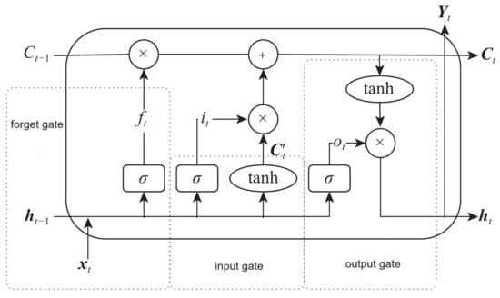 In Figure 2, is the cell state of the previous moment, is the final output value of the LSTM neuronal unit at the last moment, is the input for the current moment, is the activation function, is the output of the forget gate at the current moment, is the input gate output for the current moment, is the candidate cell status at the current moment, is the output value of the output gate, is the cell state at the current moment, and is the output of the current moment. The working of LSTM is as follows.