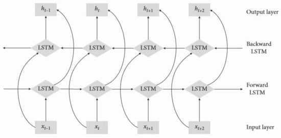 The bidirectional LSTM (BiLSTM) network, which acts as forward and backward LSTM networks for each training sequence, is employed to build a more accurate prediction model. The two LSTM networks are connected to the same output layer to provide complete context information to each sequence point. Figure 3 shows the structure of BiLSTM.