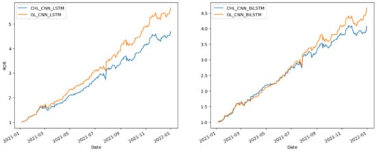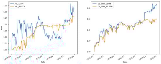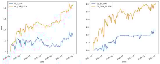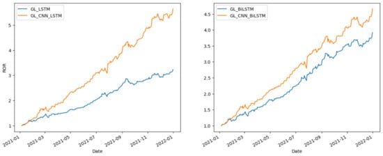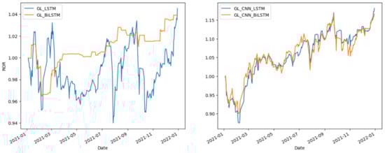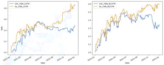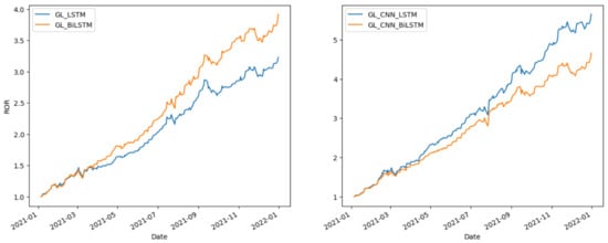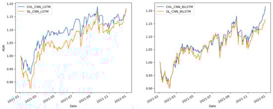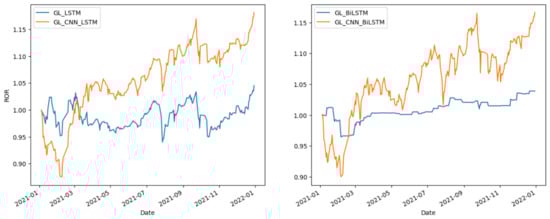 Figure 5, Figure 6 and Figure 7 provide the comparative analysis of the methods related to CNN-LSTM and CNN-BiLSTM in different markets during 2021. This shows that GL-CNN-LSTM and GL-CNN-BiLSTM consistently demonstrate excellent performance in terms of ROR. These observations indicate that utilizing GLoss, CNN-LSTM, or CNN-BiLSTM can significantly enhance stock returns in stock prediction.