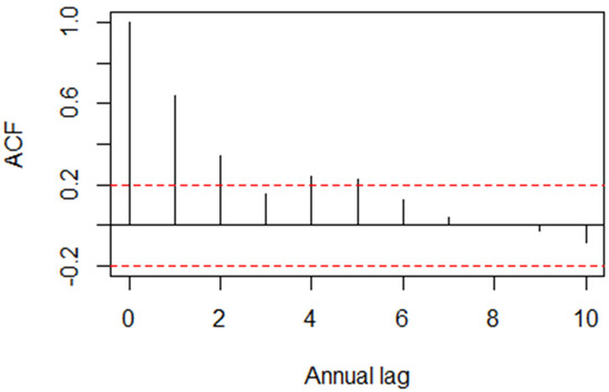 The autocorrelation function for the annual real rates of linear return on T-bills is displayed in Figure 3. Indeed, the one- and two-year sample autocorrelations lie outside the 0.95 confidence interval. As for the other two asset classes, all sample autocorrelations lie inside the 0.95 confidence interval.