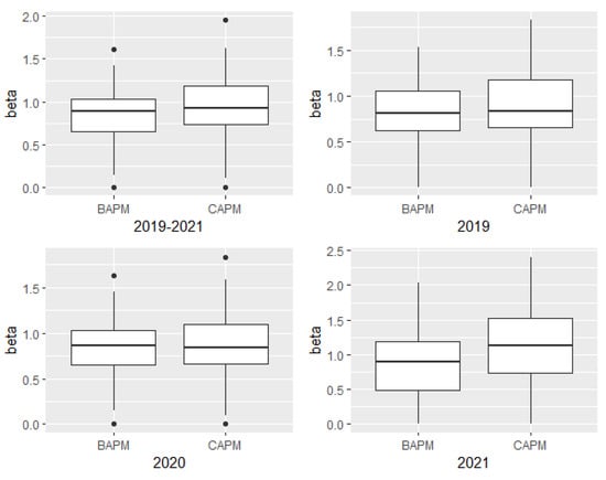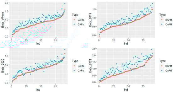 To ensure the robustness of the results, we test the betas based on every year data (2019, 2020, and 2021), rank the BAPM betas in ascending order, and plot the CAPM betas correspondingly, as shown in Figure 1. For most of the stocks, the result is robust; however, some abnormal results may occur due to the mismapping issues or the luck component (), and it happens on a few stocks in one-year-period testing.