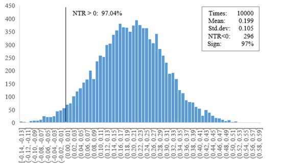 To further test the existence of market noise, we applied the Monte-Carlo method to examine whether NTR is statistically positive. As a prerequisite of the Monte-Carlo method, the normality of NTR is tested with the Shapiro–Wilk normality test (). The W-statistic is 0.972, suggesting that NTR follows a normal distribution at a 95% confidence level. Figure 3 shows the pdf for NTR with 10,000 times stimulation, of which only 296 times is the NTR value less than 0. This result is consistent with the previous tests of BAPM beta and CAPM beta; at a 95% confidence level, the NTR is statistically positive.