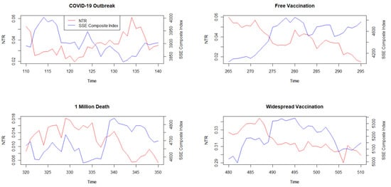 In our research, COVID-19 events are divided into the directions positive and negative. We choose four momentous events during the COVID-19 pandemic, including the outbreak of COVID-19 on 31 December 2019, the announcement of a free vaccine, the global COVID-19 deaths surpassing 1 million, and the vaccination rate reaching 20%. The first one and the third one are believed to be negative influences while the second and fourth one are positive. And the model window is selected from 30 days to 10 days before the event date to avoid being affected by other unrelated events. Table 5 shows the time reference of the model window and AR window. To measure the abnormal return of both the NTR and yield, we calculate by assigning the mean of the model window. Figure 5 shows the performance of the NTR indicator and SSE Composite Index during these events.