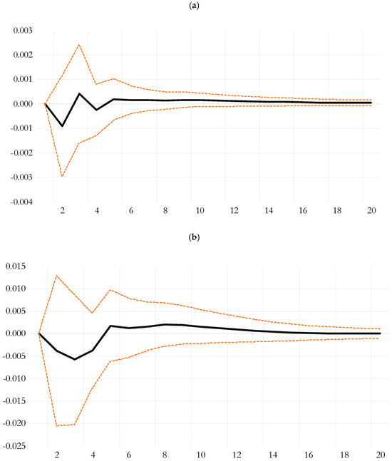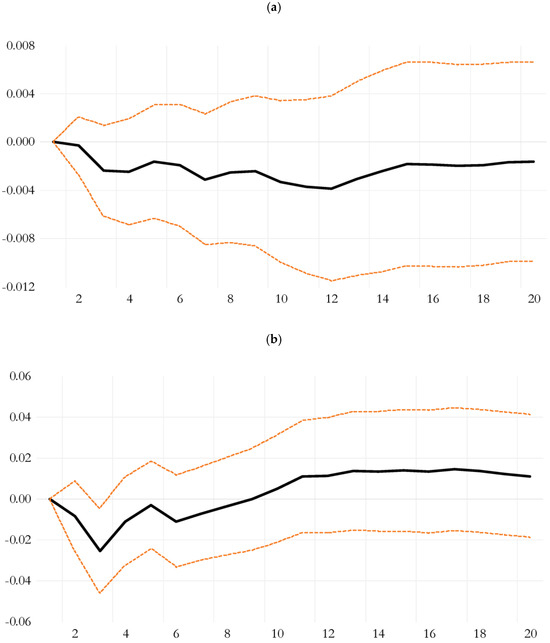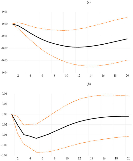 (a,b) Response of industrial rents and capital values to EPU shocks. Note: These charts represent the impulse response functions of industrial performance indicators to national uncertainty shocks (EPU). Uncertainty shocks (1 standard deviation) were applied to rents and capital values. The x-axis reflects time (quarters after the first-moment shock to uncertainty levels), while the y-axis reflects the magnitude of variation created by the uncertainty shock. The bold line tracks the IRF of the indicators within standard error confidence bands of ±2, which are represented by the broken lines. (a) IRF of Industrial Rents to EPU. (b) IRF of Industrial Capital Values to EPU.