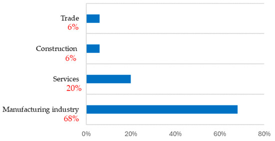 Regarding the object of activity, the sample analyzed included entities operating in various fields, namely 42 entities in the manufacturing industry (68%), 12 entities in the field of services (20%), 4 entities in the construction field (6%), and 4 entities in the field of trade (6%). Figure 1 presents the distribution of the entities included in the sample by field of activity.