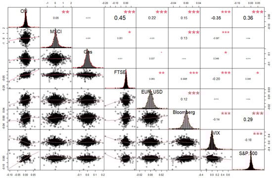 The estimated correlation matrix for the sampled markets is shown in Figure 1. As changes in oil prices might have a major impact on the entire economy, the overnight momentum series and VIX, not surprisingly, have a negative link. Stock prices rise and volatility falls (as measured by the VIX) as oil prices rise, which may indicate increased economic activity. Alternatively, a decrease in oil prices (negative momentum) may signal an uncertain or slowing economy, leading to lower stock prices and greater volatility (VIX). Most correlations are positive, implying that they increase or decrease together and are affected by the same events or risk factors. With a value of 0.45, the coefficient between ON and FTSE is the highest, suggesting a significant correlation between their returns. The correlations between the USDX, Bloomberg, and SP500 are modest, whereas those between the ones with GAS are negligible. Furthermore, the fitted lines of the bivariate scatter plots at the diagonal base show that the series correlation structures vary throughout the joint distribution of returns, implying that a QVAR method is required to characterize all the correlations.