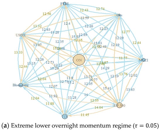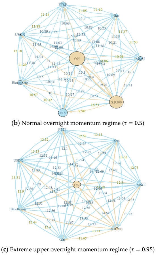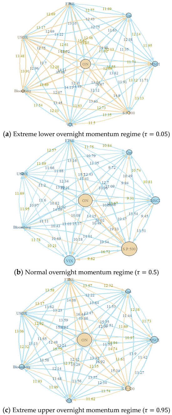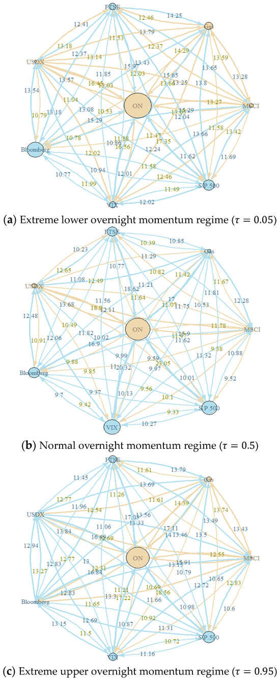 Additionally, the analysis highlights that ON significantly impacts future trading sessions, as it exhibits the highest amount of own-variance spillover. Furthermore, the impact of ON on other network variables is significant, making it a crucial indicator of price fluctuations in interconnected markets. It appears that there are not many options for diversification when faced with challenging market conditions. In addition, the analysis reveals that ON plays a crucial role in transmitting shocks within the system, while VIX is the main entity that receives these shocks. It is evident that the shock transmission of ON reflects the prevailing market sentiment and perception of risk. To fully grasp ON movements, it is crucial to have a thorough comprehension of market microstructure and trading patterns that occur outside of regular trading hours. Liquidity, trade volumes, and market reactions to news must be assessed. The discussion pertains to the reference studies (Hanif et al. 2024; Ustaoglu 2023; Jena et al. 2022) which emphasize the significance of incorporating extreme quantiles and negative return periods to accurately assess the level of interconnection and risk in the market.