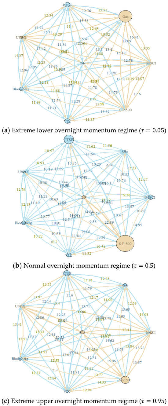 Table 2 shows the overall overnight momentum spillover received and transmitted across financial markets in the network system. This omits the details of the spillover effect on individual markets, making it difficult to identify the market with the most significant impact as a shock transmitter or receiver. The authors analyze the estimated results of the off-diagonal entries of the GFEVD matrix to identify the primary shock transmitters or receivers within the network and determine whether these markets are affected by overnight momentum shocks in the oil markets. The network graphs in Figure 2a–c illustrate the market spillovers throughout the system, where each node indicates the unique traits of its market. Net transmitters are represented by blue nodes, whereas net receivers are represented by khaki nodes. The size of the edges in each picture represents the intensity of the directional spillover, whereas the sizes of the links refer to the amount of spillover sent to or received from all other markets.