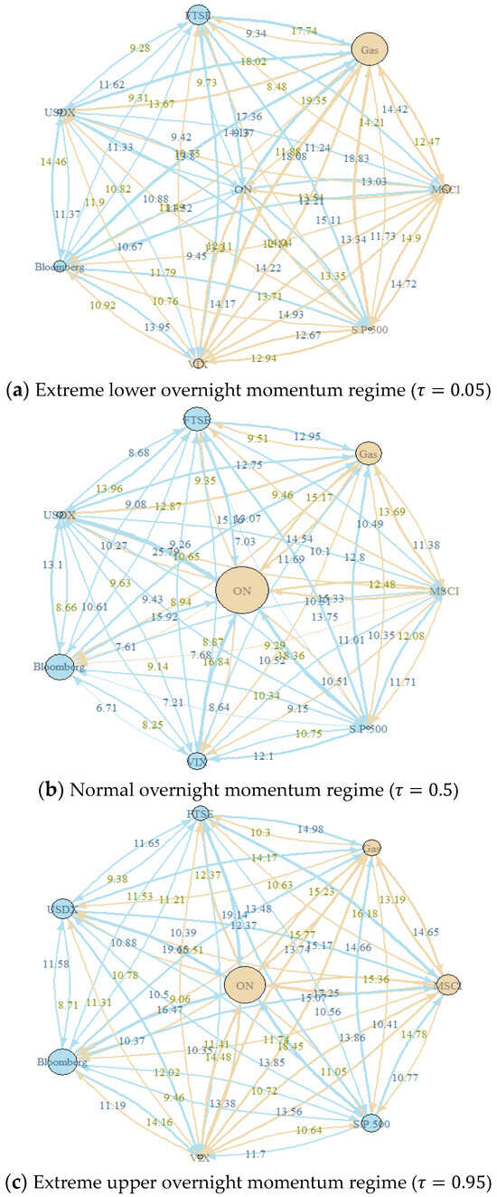 Figure 2b showcases network spillovers during normal times. It appears that all the series are highly interconnected with each other, with ON, followed by SP500, being the largest transmitted shock, while the others act as net receivers. The strongest connection we observe is between ON and SP500, followed by ON and VIX, and then between ON and other markets. Notably, the strong connection between ON and other markets indicates contagion properties. These results emphasize the relevance of the phenomenon of ensuing overnight momentum in the energy market and its impact on the other financial networks, where ON is a significant transmitter of shocks, stressing its systemic relevance because of its interrelated nature. Policymakers must oversee the stability of the energy market (and thus its overnight momentum) to guarantee overall financial stability. The correlation between ON and major indexes such as the S&P 500 and VIX underscores its influence on investor sentiment and market performance. Policymakers may need to adopt legislative measures to reduce the extreme fluctuations and risks that affect the entire system. The contagious nature of ON highlights the need to implement proactive policy measures to strengthen market resilience and reduce the contagion’s impact.