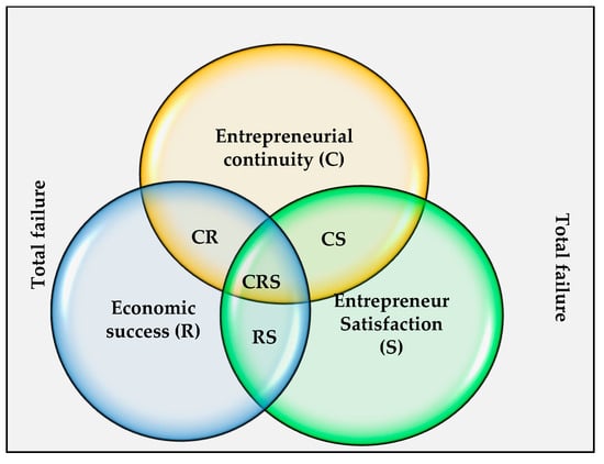 Figure 1. Total success corresponds to the “CRS” space where all the success criteria are identified. In this space, the company is not only sustainable (i.e., has passed the 3-year mark) but also economically efficient and meets the creator’s expectations. Therefore, partial success concerns only two dimensions out of three. This type of success corresponds to three situations: the company is viable and sustainable but does not fulfill the aspirations of the creator (CR space); it survives, and its owner is satisfied with it despite a certain economic tension (space CS); or the entrepreneur makes a positive exit, that is to say, puts an end to his activity for reasons other than economic or dissatisfaction (space RS). Marginal successes correspond to cases where success is reflected in only one dimension. In these cases, the company goes through the start-up phase, but the entrepreneur is disappointed because of his poor financial performance and his unfulfilled personal aspirations (space C); it performs economically, but its owner does not manage to realize it and chooses to put an end to it (space R); or finally, despite the shutdown of the business and the difficulties encountered, the entrepreneur remains no less proud of his adventure (space S). At the extreme end of these situations is total failure, where the business is neither sustainable nor profitable nor satisfactory to the creator.