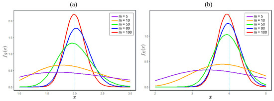 There are several methods to determine the distribution of ; the most common is the Moment Generating Function (MGF). However, the MGF distribution may sometimes be complex, making it difficult to approximate with commonly known distributions. Therefore, the theoretical distribution that best fits , denoted as , will be determined through further testing, specifically using Goodness-of-Fit (GoF) tests. In this study, GoF is conducted by applying the Kolmogorov–Smirnov (KS) test and calculating the Akaike Information Criterion (AIC) values for various possible distributions. After obtaining the KS test results and AIC values for each tested distribution, the best-fitting theoretical distribution is identified as the one with the highest p-value from the KS test and the lowest AIC value. The results of testing several distributions of X with different sample sizes m are provided.