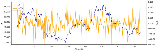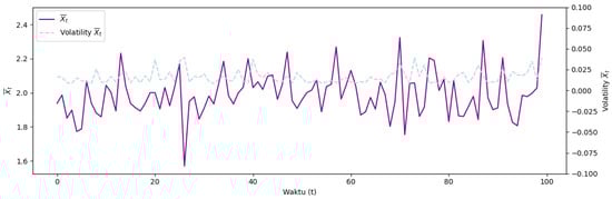 The focus of the research was on simulating an expected risk of Model Type II with credibility, applied specifically to Bitcoin assets. By incorporating daily average prices and credibility theory, the model aims to deliver reliable and accurate predictions of potential losses. Hourly Bitcoin price data were collected from 28 February 2021 to 28 February 2022, resulting in 8,784 observations. From these data, daily average prices were calculated to obtain the expected risk model, which is expressed as , where represents the average price of the asset at time . Figure 5 illustrates these calculations. The simulation was conducted to demonstrate the effectiveness of the Model Type II expected risk with credibility in enhancing the accuracy of risk predictions for Bitcoin, known for its high volatility. This approach offers a more robust tool for managing risk in the rapidly evolving cryptocurrency market.