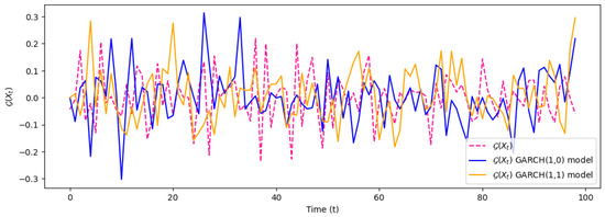 Subsequently, the GARCH heteroscedastic model (p,q) for and , referring to GARCH(1,0) and GARCH(1,1), was fitted to the data. The most appropriate model for the expected risk model was selected based on the smallest Akaike Information Criterion (AIC) value and the largest log-likelihood value. The model-fitting results and parameter estimates for the GARCH(p,q) models are presented in Table 2.