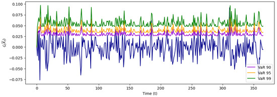This illustration demonstrates the Value-at-Risk (VaR) in the expected risk model applied to the GARCH(1,1) process, showcasing how the model estimates risk at different confidence levels. The visual includes VaR metrics for confidence levels of 90%, 95%, and 99%, providing a comprehensive view of how potential risk varies under these different thresholds. By depicting these levels, the illustration highlights the sensitivity of the risk assessment to changes in confidence levels, offering valuable insights into the robustness and precision of the VaR model within the context of the GARCH(1,1) framework.