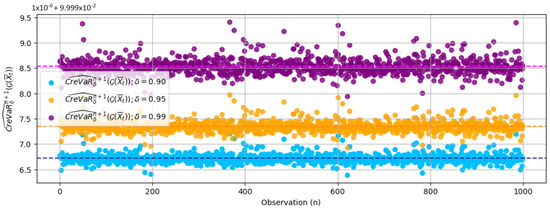 The expected risk model for Bitcoin assets, derived using the GARCH(1,1) process and Value-at-Risk (VaR), demonstrated the model’s effectiveness in capturing both short-term and long-term volatility dynamics. The practical application involved simulating the VaR and Credible Value-at-Risk (CreVaR) forecasts with 1,000 iterations, resulting in the estimation of GARCH(1,1) parameters: , , and . There may be differences in the estimated parameter values due to iteration and involvement in generating data. It is important to acknowledge these potential discrepancies when interpreting the results of the VaR and CreVaR forecasts. The iterative nature of the process, combined with the generation of data, can introduce variability in the estimated parameter values. Therefore, the forecast of VaR and CreVaR of the expected risk model at the confidence level was captured, as shown in Table 3.