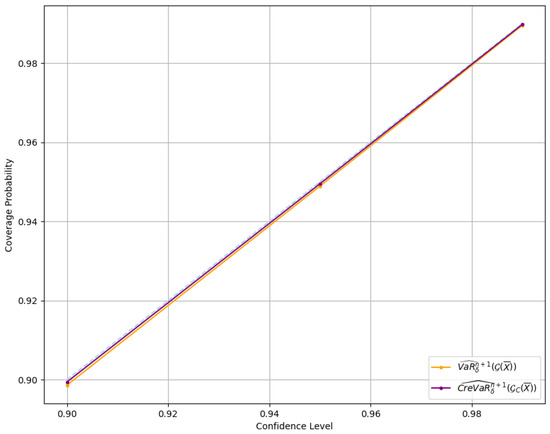 To better understand the effectiveness of CreVaR forecasts within the credible expected risk model using the GARCH(1,1) process, it is essential to evaluate how accurately these forecasts reflect underlying risk. This involves examining the relationship between coverage probability and the confidence level associated with the CreVaR forecasts, allowing us to assess the model’s ability to predict extreme losses and the alignment of forecasts with confidence levels, as shown in Figure 8.