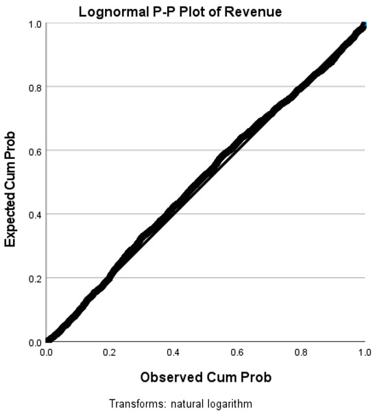 The data variables under study are the hospital’s expenses and revenues from the Definitive Healthcare data for a given period. Table 1 shows the study data descriptive statistics. Our study data meets the requirement for our new method because they are not normally distributed, as is evident from the Kolmogorov–Smirnov test results in Table 2 and Table 3 and from the p-p plots in Figure 1 and Figure 2. Thus, Altman’s Z-score, Ohlson et al.’s O-score, and Hillegeist et al.’s methods are inapplicable. A new method needs to be constructed as the existing relevant literature does not have a method for financial data with a lognormal normal.