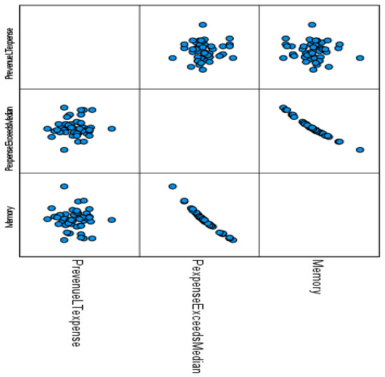 Figure 14 provides the correlation pattern among all three analytic results (namely PR (revenues < expenses), PR (expenses exceed the state’s median expenses), and the hospital’s memory of the finance variables) across the US states which reveals an interesting advantage of our stochastic approach as these are not possible in the Z-score, regression, modified Altman Z-score, Ohlson O-score, or Zmijewski X-score approach.
