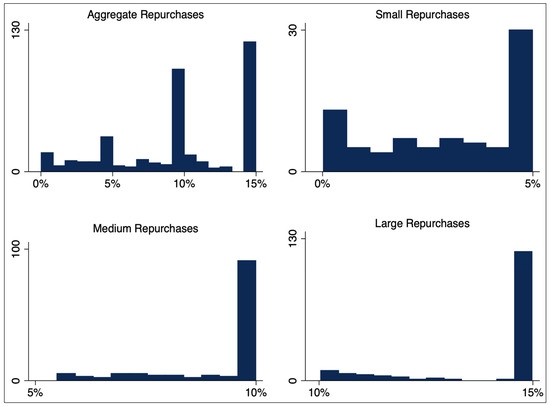 The frequency distribution of repurchase announcements based on the proportion of outstanding shares intended for buyback is presented in Figure 1, and the sample’s summary statistics are presented in Table 1. Given that firms are highly inclined towards opting for repurchases at the 5% interval cut-off, we subcategorize the sample into three subsets. The first is Small Repurchases, which are those that intend to buy back ≤5% of the outstanding stock volume, and there are 82 such repurchases, thus representing 23% of the sample. The second is Medium Repurchases, which are those that intend to buy back 5%<, but ≤10% of the outstanding stock volume, and there are 128 such repurchases, thus representing 36% of the sample. The third is Large Repurchases, which are those that intend to buy back >10% of the outstanding stock volume, and there are 150 such repurchases, thus representing 41% of the sample.