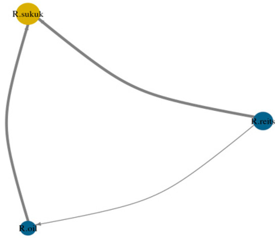 Regarding the spillover receiver, oil receives the most spillover from the network, followed by sukuk and REITs. Nevertheless, based on the “Net” designation, it is evident that REITs and oil are the net transmitters to the network, and sukuk receives net spillovers from the network. In addition, REITs are a higher transmitter than oil. The finding is supported by (Huang and Lee 2009; Nazlioglu et al. 2020). Figure 1 exhibits the network of three assets.