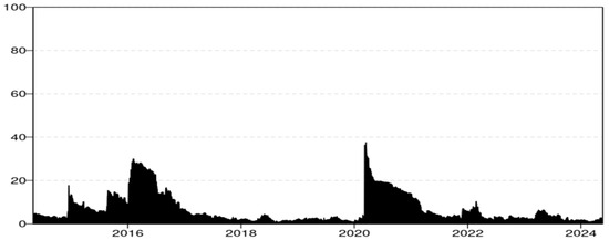 Figure 2, Figure 3, Figure 4 and Figure 5 graphically show the dynamic connectedness to highlight all assets’ connectedness. Figure 2—Total Connectedness Index (TCI) displays the average impact of a shock in one series on all others. TCI shows the peak impact of an asset series on the others at the beginning of 2016 and early 2020, with an average value approaching 40%. Several crises occurred during that time, including the Venezuelan economic crisis and the outbreak of COVID-19. The correlation between the three asset classes is likely strong during the economic downturn. Furthermore, the average connectivity typically ranges from 5% to 10%.