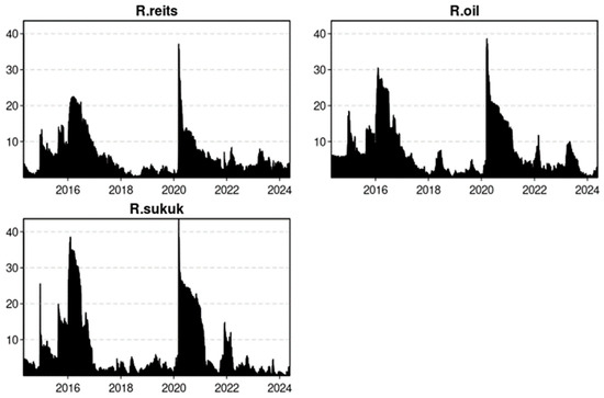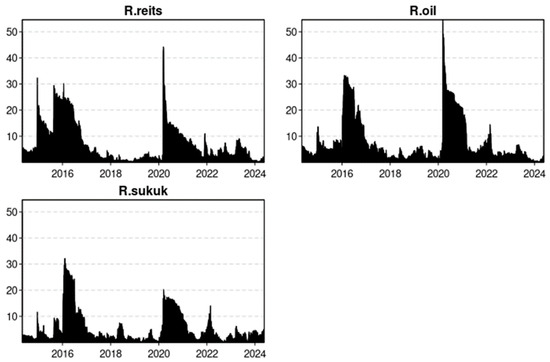 Furthermore, Nazlioglu et al.’s (2020) findings confirm that the oil market typically generates the highest volatility for sukuk in GCC countries, as the graph demonstrates. Lastly, the volatility spillover between REITs and oil is reciprocal, meaning that during specific periods, REITs act as transmitters to the oil markets, while during other periods, the opposite is true. This finding is supported by Huang and Lee (2009). However, it is inconsistent with the studies by Fasanya and Oyewole (2023) and Mensi et al. (2023), who argued that REITs transmit volatility to the oil market.