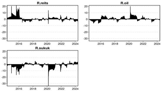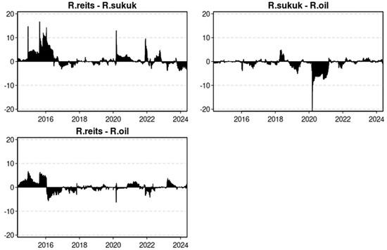 Table 3 presents the dynamic spillover effects between each asset and system. The label “From Others” in the final row denotes the directional connectivity that each asset receives from the system. Furthermore, the “To Others” label at the bottom of every column signifies that each asset disseminates its impact on the other assets. This table indicates that oil is the most prominent transmitter among the assets, with REITs closely behind. In contrast, sukuk has the lowest transmission power compared to the other assets.