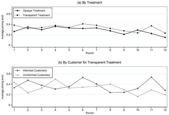 Price efficiency by treatment and customer type. Graph (a) illustrates plots of average pricing error in the two treatments for each round. Graph (b) displays the average pricing error for each customer in the Transparent treatment, for each round.