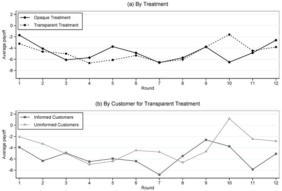 Payoff by treatment and customer type. Graph (a) illustrates plots of average dealer’s payoff in the two treatments, for each round. Graph (b) displays the average dealer’s payoff for each customer in the Transparent treatment, for each round.