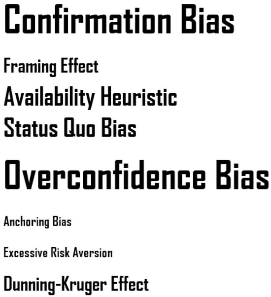 Among the biases examined, overconfidence bias (Lichtenstein et al. 1982; Pallier et al. 2002; Moore and Healy 2008) emerged as a key factor, characterized by individuals overestimating their knowledge or abilities, which can lead to riskier financial decisions (Barber and Odean 2001). Confirmation bias (Nickerson 1998; Oswald and Grosjean 2004) was also identified, reflecting the tendency to seek out information that supports existing beliefs while disregarding conflicting evidence. This selective focus can lead to unbalanced decision-making, especially in investment contexts.