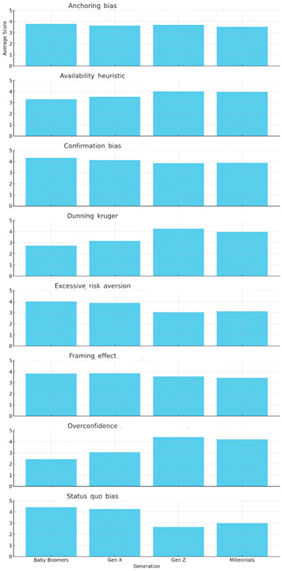 As shown in Table 1, eight cognitive biases primarily influenced the test, with their relative importance illustrated in Figure 1. The word cloud illustrates the prominence of the cognitive biases identified across the 30 questions of the National Financial Capability Test. The size of each term reflects the frequency with which the corresponding bias appeared in the responses to the test questions. For example, overconfidence bias and the Dunning–Kruger effect were prominently displayed, indicating their strong influence on a wide range of questions. Similarly, status quo and confirmation biases appeared frequently, emphasizing their relevance to questions focused on maintaining established practices and reinforcing pre-existing beliefs. This visualization provides an overview of how the test content aligns with various cognitive biases, setting the stage for further analysis of their generational impacts.