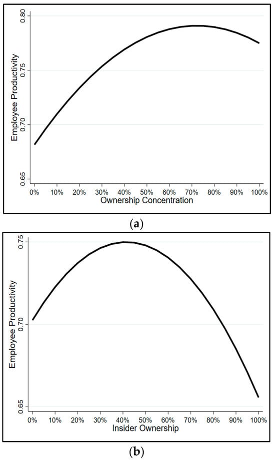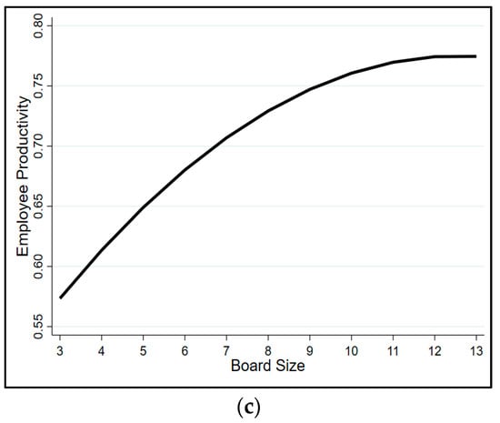 (a) The non-linear relation between employee productivity and ownership concentration; (b) The non-linear relation between employee productivity and insider ownership; (c) The non-linear relation between employee productivity and board size.