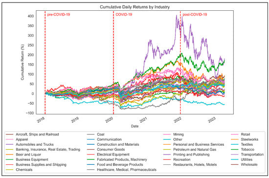 We sourced the data from 1 January 2018 to 31 March 2023, with three distinct periods defined within this window. The pre-COVID period was defined as the period from 1 January 2018 to 1 January 2020 (n = 503 trading days), while the COVID period was defined as the period from 18 January 2020 to 15 December 2021 (n = 482 trading days). The post-COVID period was defined as the period from 1 January 2022 to 31 March 2023 (n = 290 trading days). The selection of the pre-COVID period was chosen as the two years before the emergence of the pandemic in the first months of 2020. The COVID period was chosen as the date of the announcement of the first case in the U.S.A. (CDC 2020) until the Federal Reserve (2021) announced its intentions to unwind the stimulus policies implemented for pandemic relief. Finally, the post-COVID period was selected as the month following this announcement until the most recent date when data were available. In total, thirty distinct industries within the U.S. stock market have been considered in this analysis. Each industry is outlined in Figure 1 alongside its respective cumulative daily return over the entire period under analysis. Stock returns in the U.S. stock market displayed distinct patterns across three key periods: pre-COVID, COVID, and post-COVID. Relative to the following two time periods, the pre-COVID phase was characterized by relative stability, with mixed stock returns. In 2018, a clear upward trend is observed, reflecting investor confidence amid favourable monetary policy conditions, low interest rates, and low inflation metrics. In late 2018, a significant correction is evident, with all sectors dropping from their peaks in September to the end of December. This correction was influenced by concerns about global economic growth, trade tensions (particularly between the U.S. and China), and fears of rising interest rates.