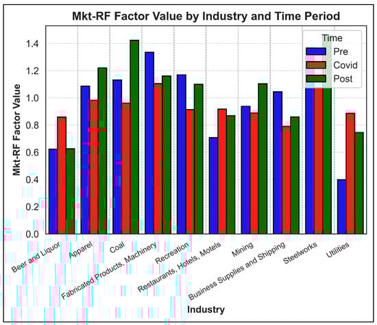 This section outlined the overarching market-wide results of the FF5M and the factors in each period. The following section will be divided into five subheadings, each representing one of the Fama–French factors. In the case of the Market Risk Factor (Mkt-RF), we examine industries where the value changed by 20% or more as the market transitioned through each period. Examining each subsequent factor, we expand on the previous section and analyse the industries where the value of the Fama–French factor coefficient went from positive to negative, or vice versa, as we moved from the pre-COVID-19 window to the COVID-19 and post-COVID-19 windows. Through this, we highlight significant sectoral changes in the behaviour of the Fama–French factors throughout the pandemic.