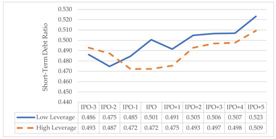 Figure 1 illustrates variations in short-term debt ratios around IPO years across different types of firms. Groups are constructed based on leverage levels at the time of the IPO. Firms with higher leverage generally exhibit lower short-term debt ratios compared to their lower-leverage counterparts, consistent with the predictions of