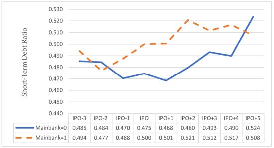 2009), a main bank is defined as whether it is one of a firm’s top ten largest shareholders. The figure reveals distinct patterns: firms with a main bank relationship exhibit a stable short-term debt ratio before and after the IPO, reflecting a more consistent financial structure. By contrast, firms without a main bank relationship experience a temporary decline in short-term debt around the IPO year. This suggests that firms lacking a main bank undergo greater financial scrutiny and may reduce short-term debt more aggressively during the IPO process.