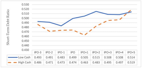 Figure 3 displays a rise in short-term debt usage for firms with lower cash holdings and a decline for firms with higher cash holdings. Firms with higher cash holdings at the IPO year exhibit a stronger preference for long-term debt post-IPO. In