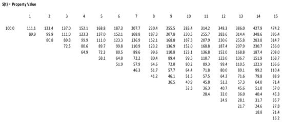 Based on Equations (1)–(3) the 15-year–15 steps interest-only mortgage loan value tree is shown in Figure 4:
