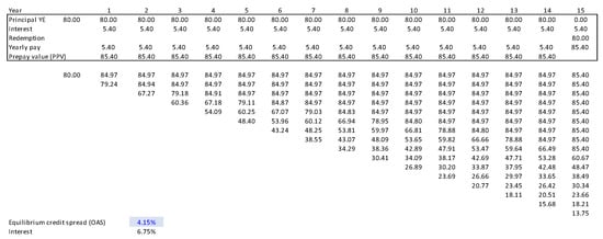 The loan’s interest is composed of the risk-free rate r plus an option-adjusted credit spread (OAS). The OAS is obtained by iterating until the OAS leads to the market value of the loan being equal to its nominal value. Such a spread is considered the equilibrium OAS15.